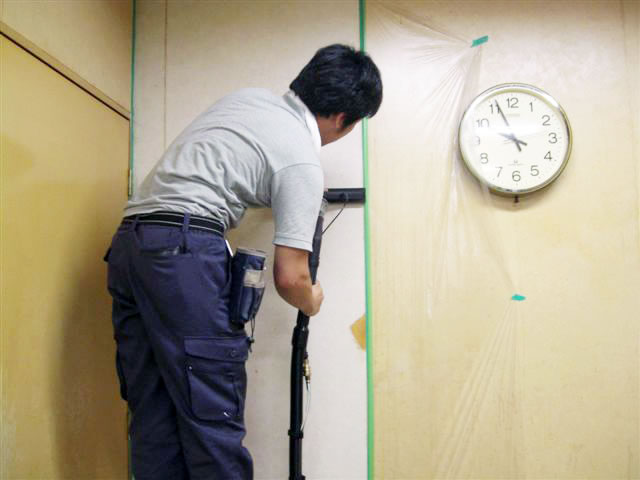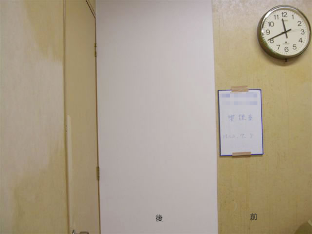 タバコのヤニで黒ずみ、壁掛け時計の跡が目立ちます。